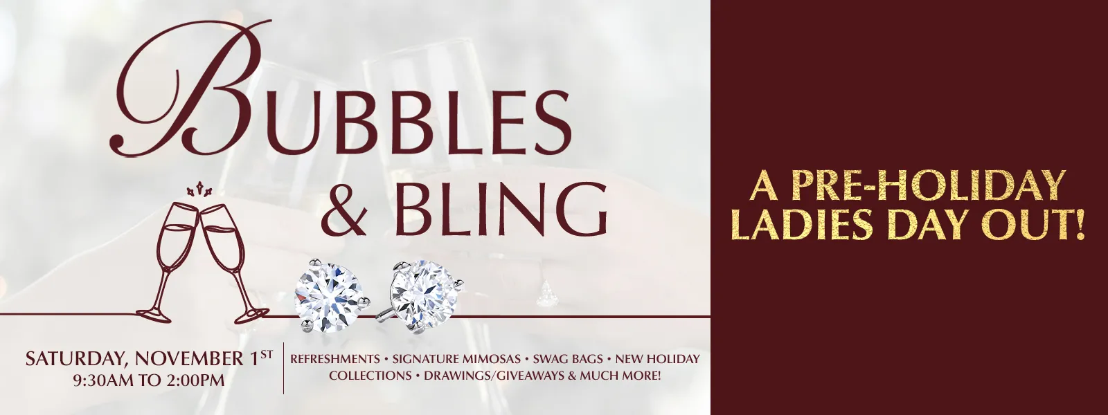 Ladies, it’s time to treat yourself! Join us at Ellsworth Jewelers for our 3rd Annual Bubbles & Bling - Ladies Day, where glamour, fun, and holiday magic come together for an unforgettable girls' day out. Whether you're looking to spoil yourself or get a head start on your holiday wish list, this exclusive event is the perfect way to kick off the season in style.